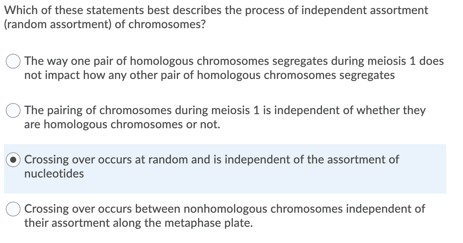Independent assortment occurs during the process of meiosis. Which best describes the law of independent assortment. Crossing over along one.